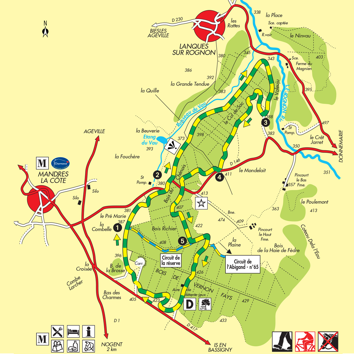 Au bout de 2 km, laisser sur la droite le petit circuit de la Réserve et poursuivre tout droit en restant sur le chemin de bordure séparant les communes de Lanquessur-Rognon et de Mandres-la-Côte. Contourner ainsi une partie du bois du Chênois pour déboucher sur la D146.