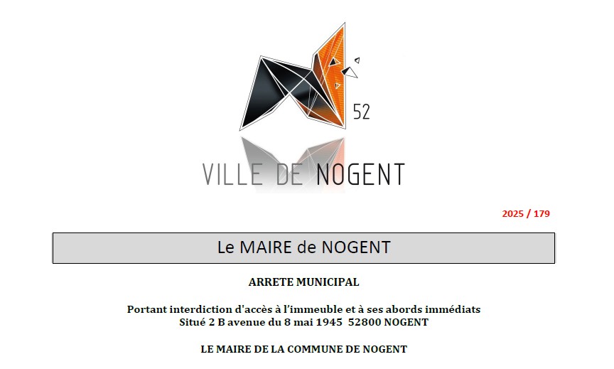 ARTICLE 1 : A compter du 12 décembre 2025 l'accès à l’immeuble situé 2 B avenue du 8 mai 1945 – 52 800 Nogent et à ses abords immédiats est interdit à toute personne physique. Toutefois les accès à l’immeuble sinistré et à ses abords resteront autorisés de manière ponctuelle, pour permettre toutes démarches de sécurisation, d’investigation et d’expertises, aux services de la Ville de Nogent, du SDIS, tout expert ou homme de l’art mandaté par les assurances des propriétaires, de la sécurité publique et à toute personne dûment autorisée par ces derniers.