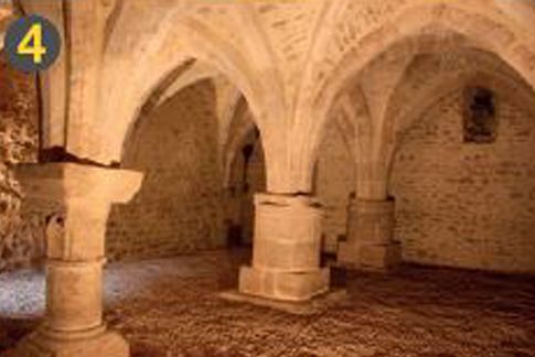 Emplacement de l’ancienne crypte. Orientée sud-nord, elle a l’apparence d’une crypte à deux nefs. Trois piliers sont communs à ces deux nefs. De ces piliers partent les nervures, ogivales et sans moulure, de la voute.