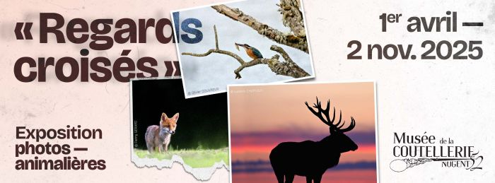 Le Musée de la coutellerie présente la nouvelle exposition temporaire REGARDS CROISÉS, qui explore les animaux dans leur milieu naturel. Cette exposition, enrichie par les photographies de Ludovic Chaffaut, Olivier Couvreur et Fanny Gerard, complète la thématique « Animalia ». À travers leurs clichés, les photographes nous plongent dans l'univers fascinant de la faune, capturant la beauté et la fragilité de la nature.